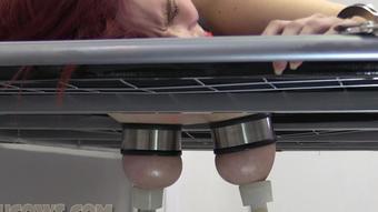 breast training machine, bondage, ball gag, tits bondage Arabella banded udders HuCows.com