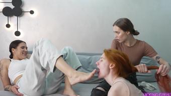 fetish place 3 dommes foot dominating male slave and ordering him swallow their feet Clips4Sale